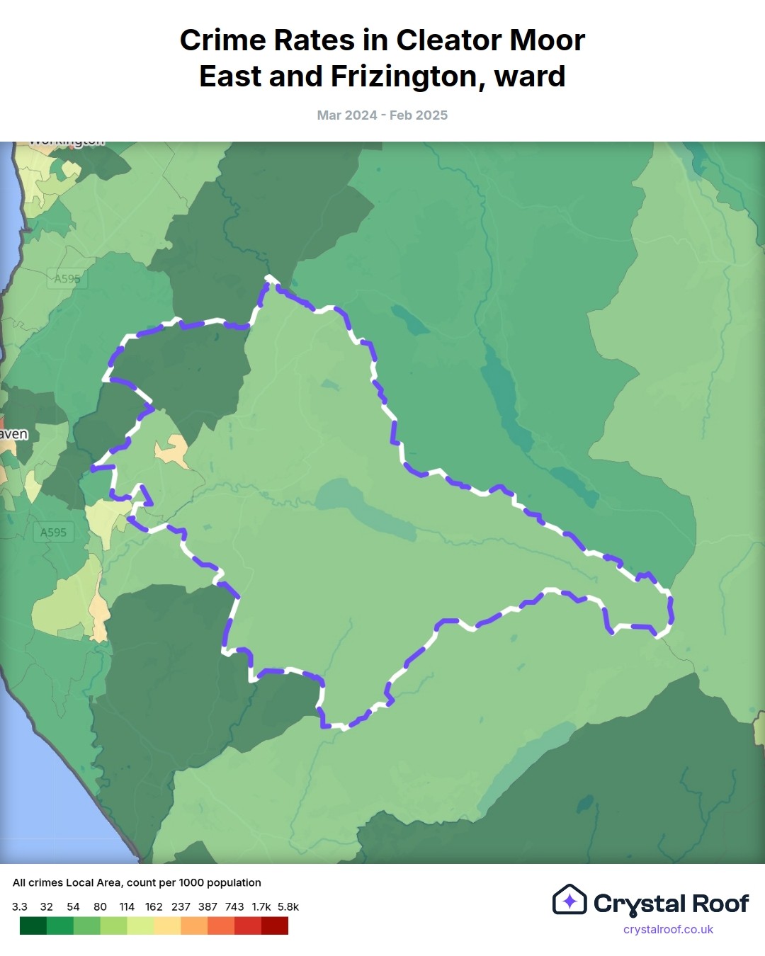 The figures in grey indicate the relative ratings of Cleator Moor East and Frizington (ward) for a specific crime type compared to other wards in England and Wales.