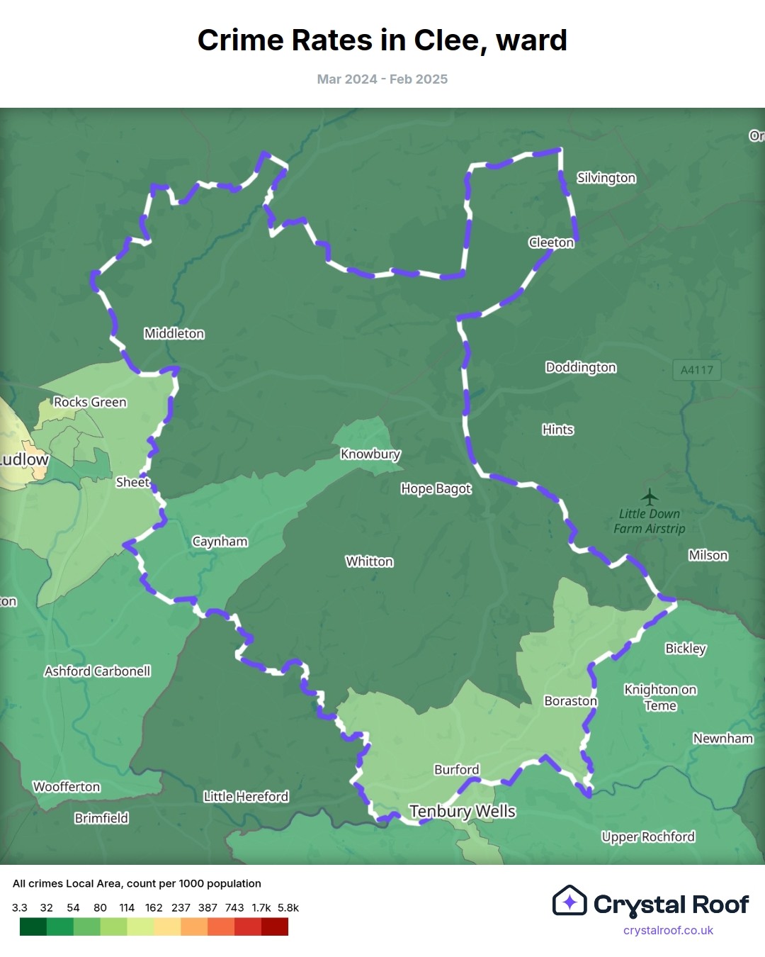 Clee (ward) is located within Shropshire (borough). Annual total crime rate in Shropshire (borough) is 62.3 crimes per thousand resident population, which can be rated as 2 out of 10 or low crime level compared to other local authority districts in England and Wales.