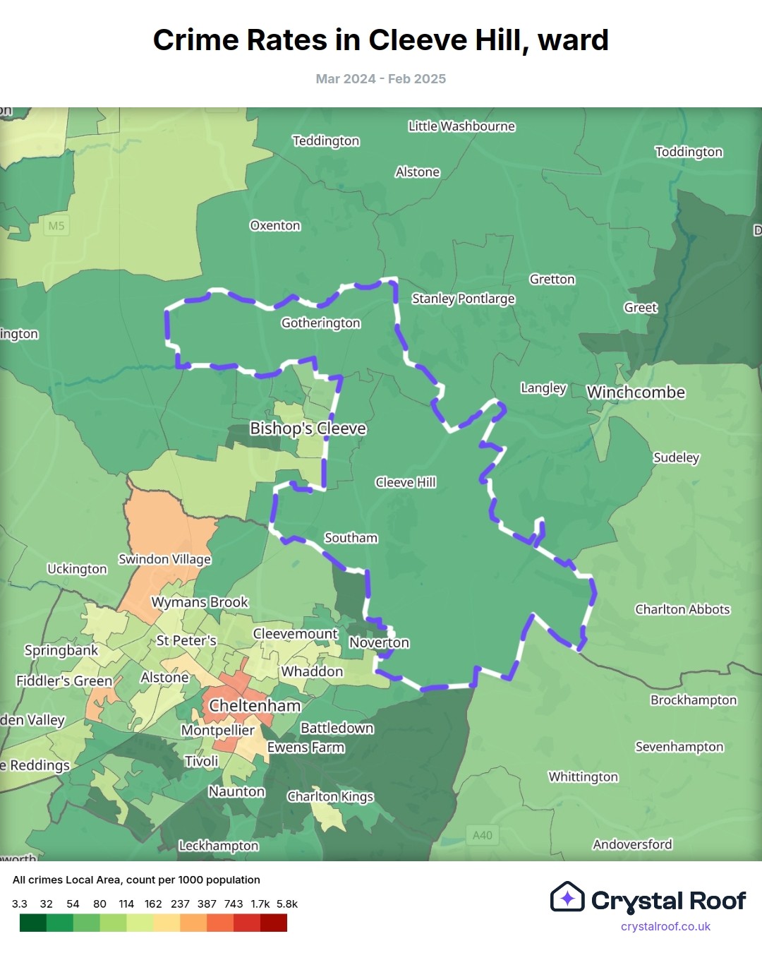 Cleeve Hill, (ward) includes areas with the following crime ratings (see map):