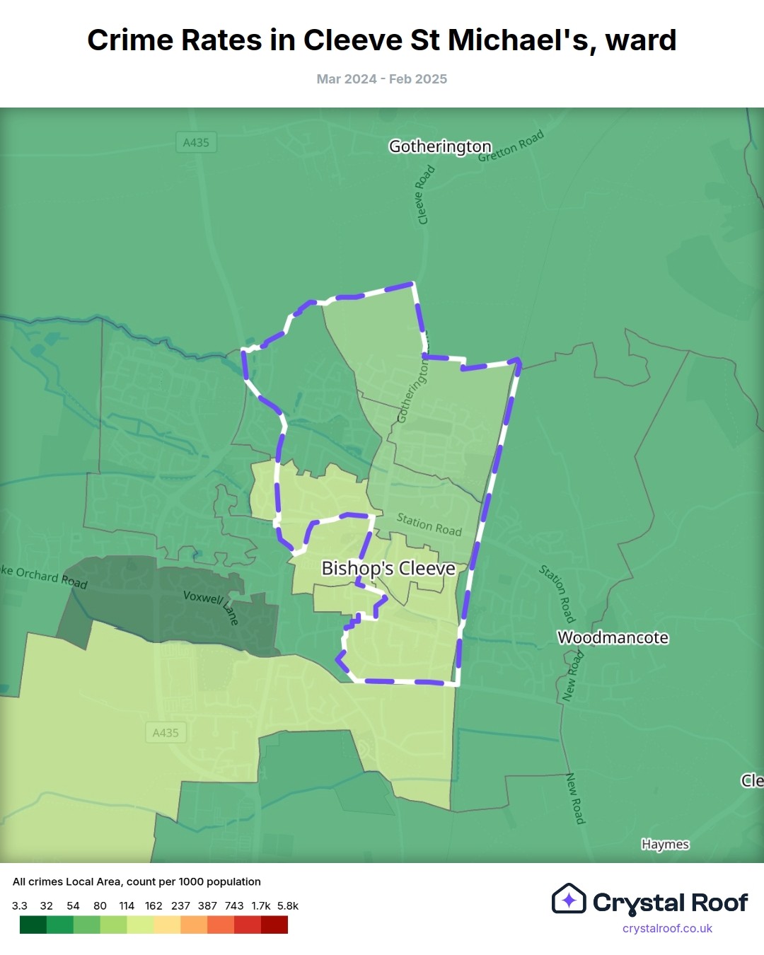 Cleeve St Michael's, (ward) includes areas with the following crime ratings (see map):