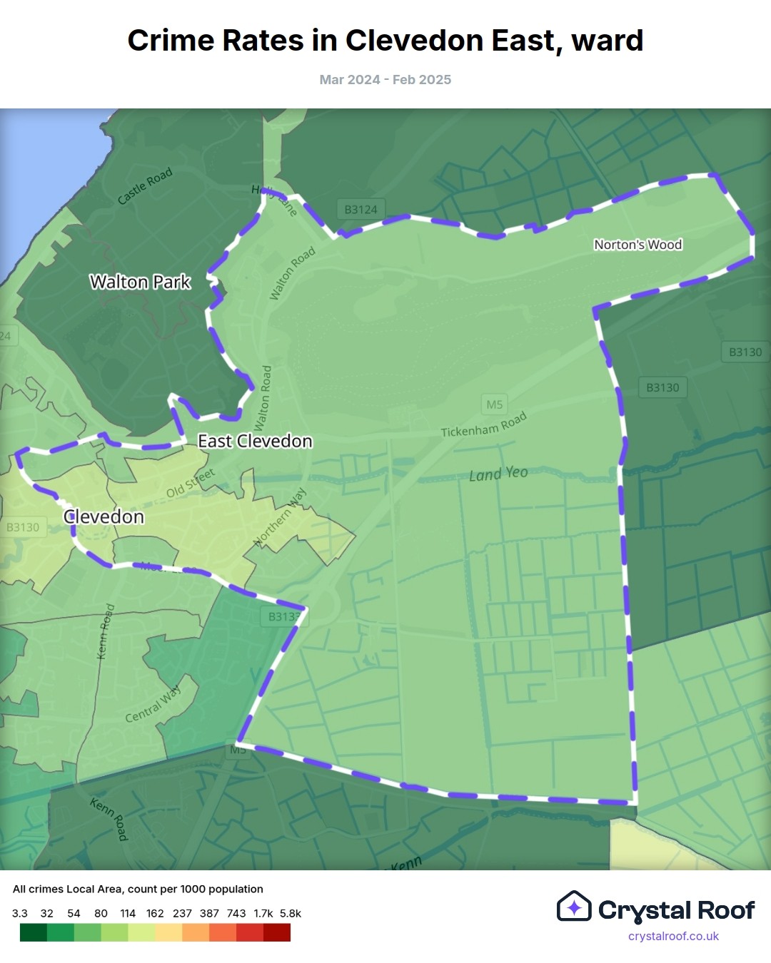 Clevedon East, (ward) includes areas with the following crime ratings (see map):