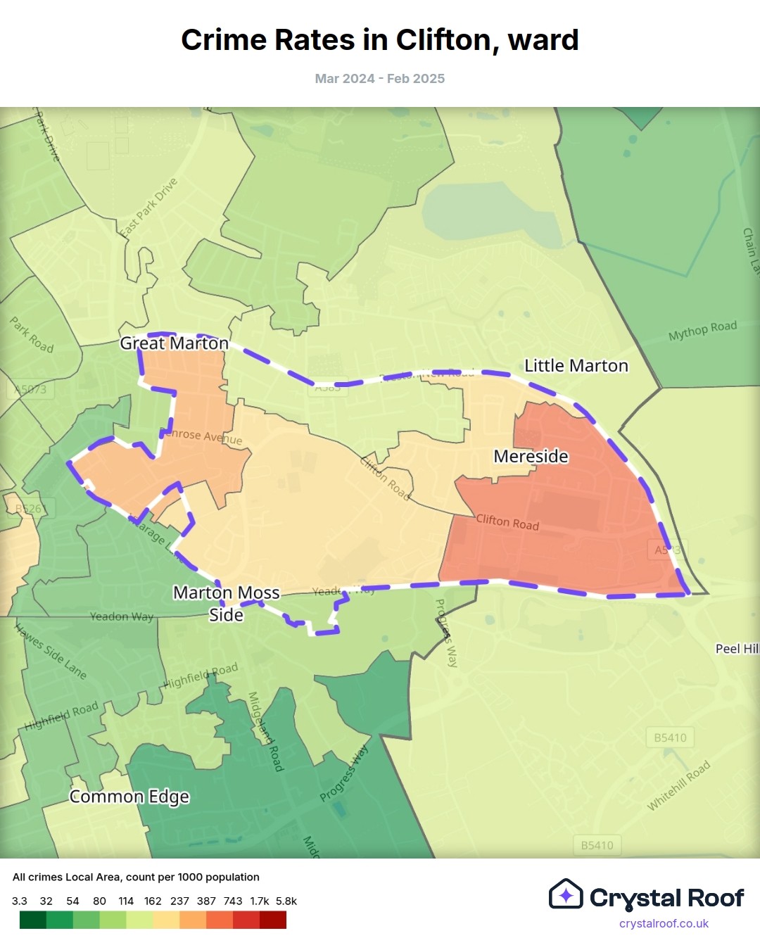 Clifton, (ward) includes areas with the following crime ratings (see map):