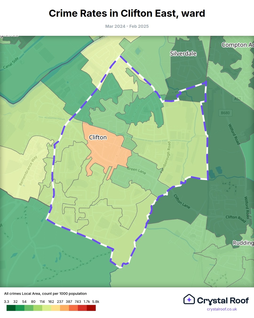 Clifton East, (ward) includes areas with the following crime ratings (see map):