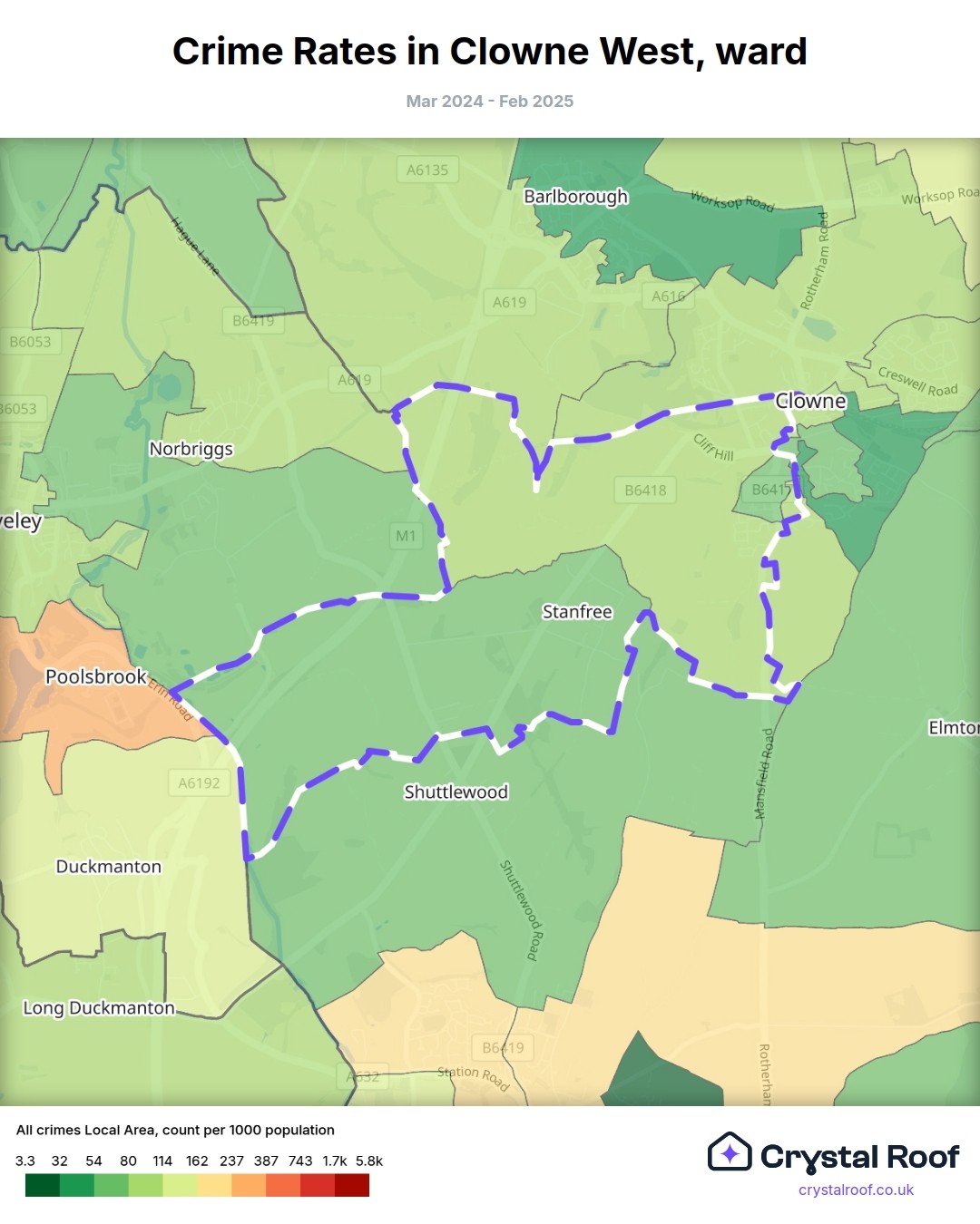 Clowne West, (ward) includes areas with the following crime ratings (see map):