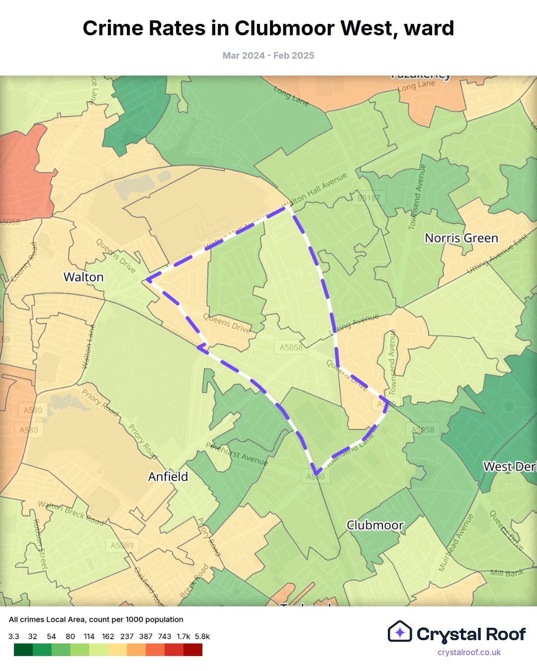 Clubmoor West, (ward) includes areas with the following crime ratings (see map):