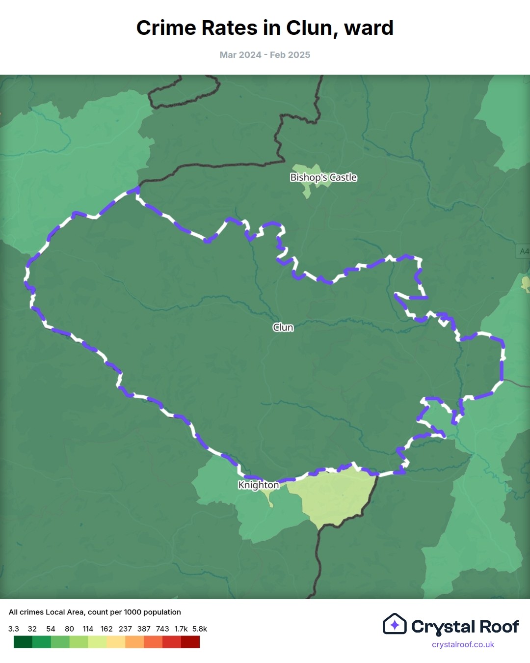 Clun, (ward) includes areas with the following crime ratings (see map):