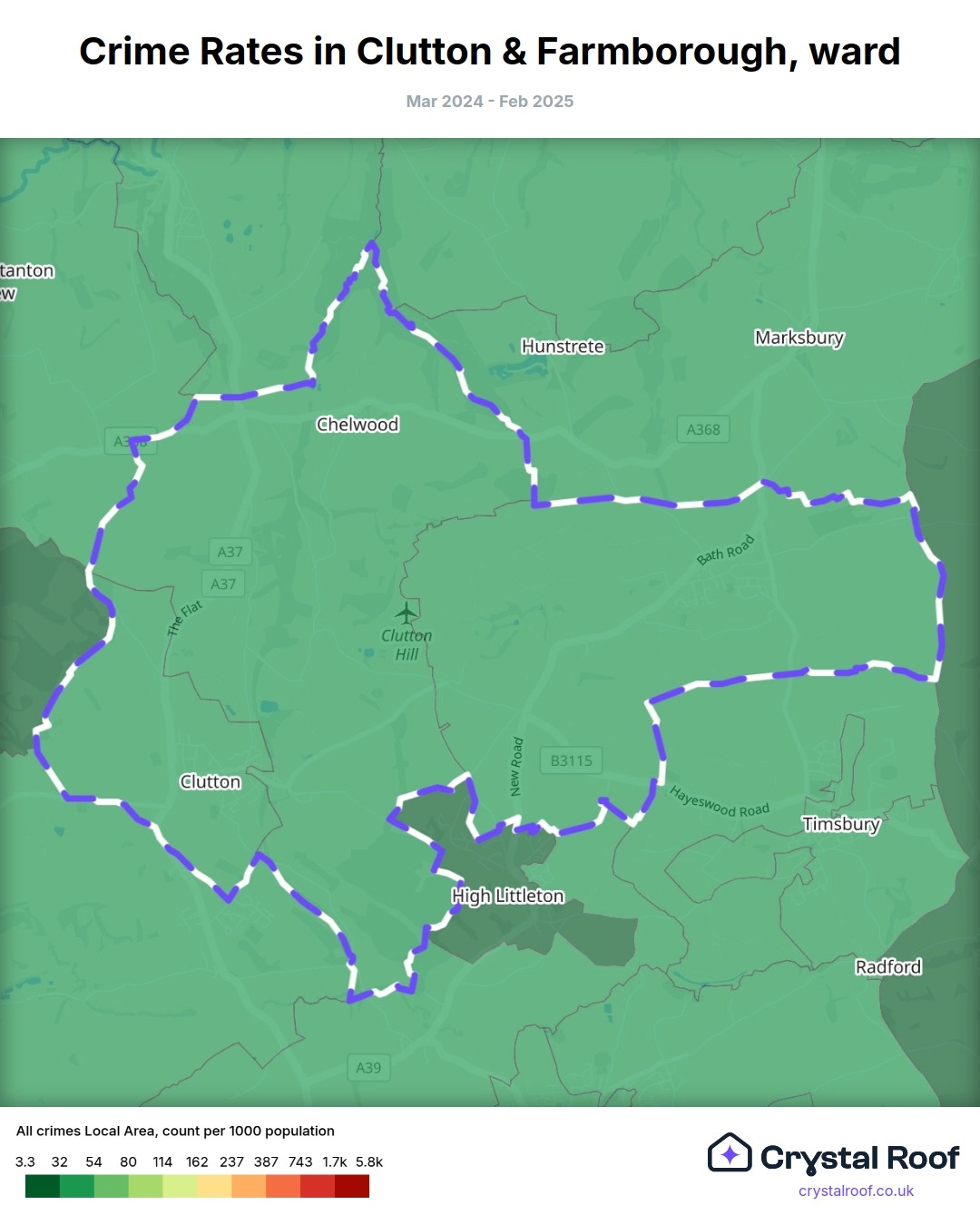 Clutton & Farmborough, (ward) includes areas with the following crime ratings (see map):