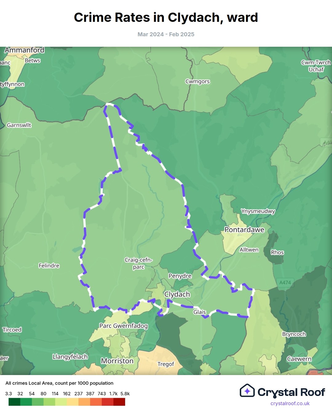 The figures in grey indicate the relative ratings of Clydach (ward) for a specific crime type compared to other wards in England and Wales.