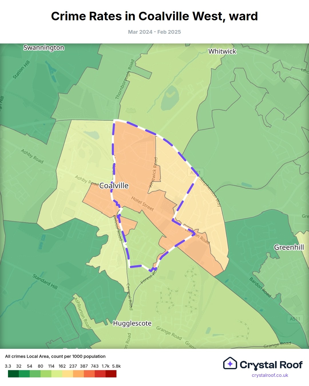 Coalville West, (ward) includes areas with the following crime ratings (see map):