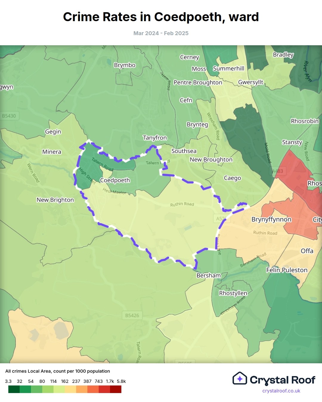 Coedpoeth, (ward) includes areas with the following crime ratings (see map):
