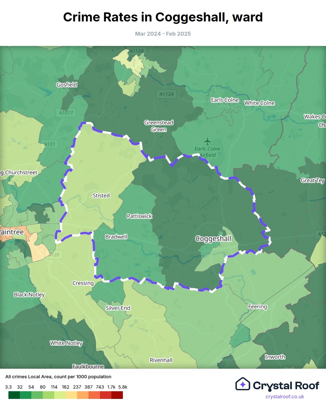Coggeshall, (ward) includes areas with the following crime ratings (see map):