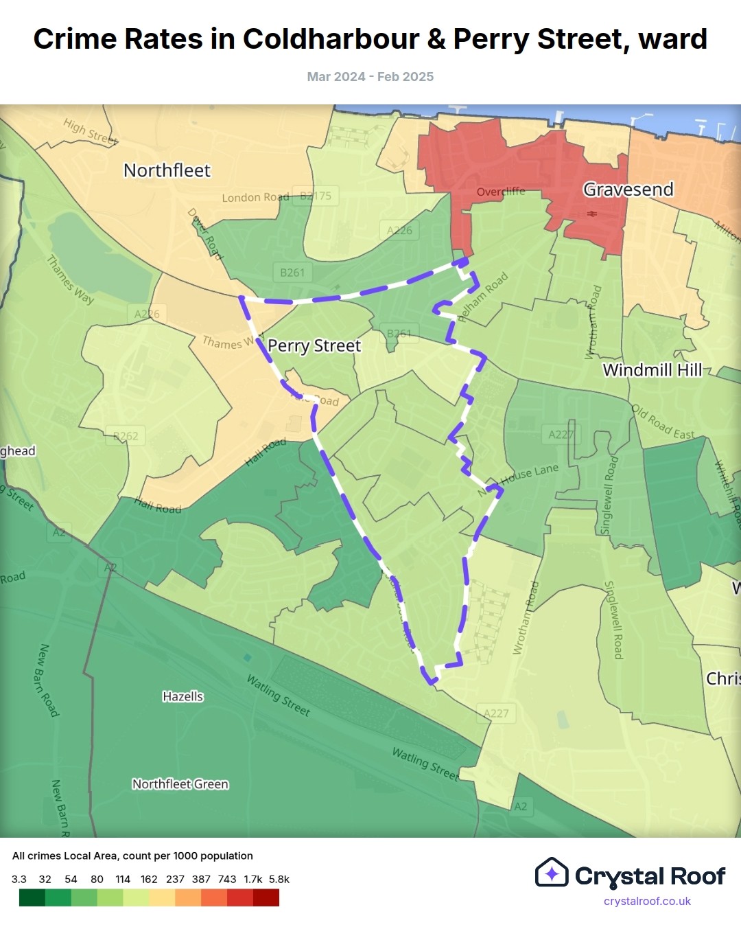 Coldharbour & Perry Street, (ward) includes areas with the following crime ratings (see map):