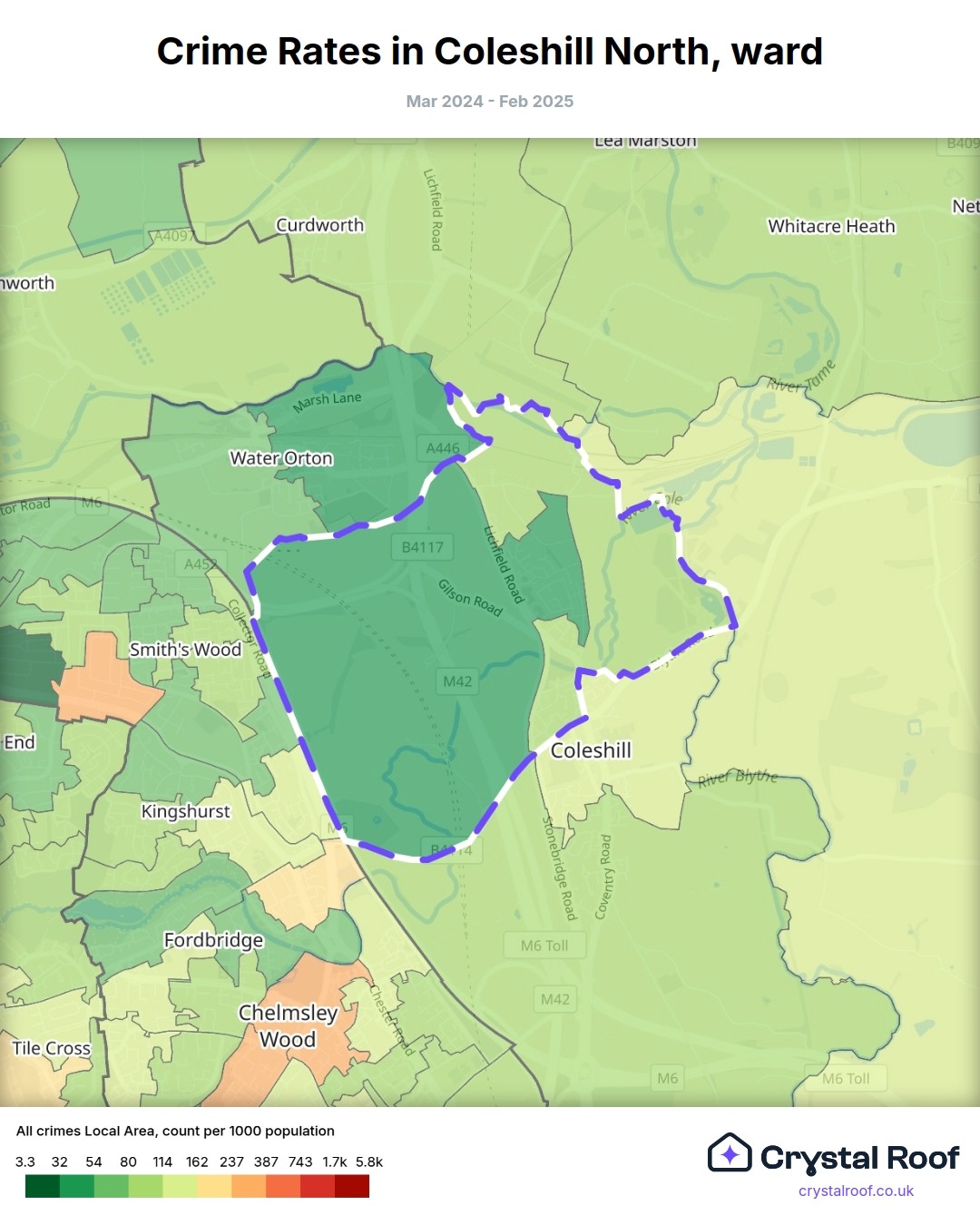 Coleshill North, (ward) includes areas with the following crime ratings (see map):