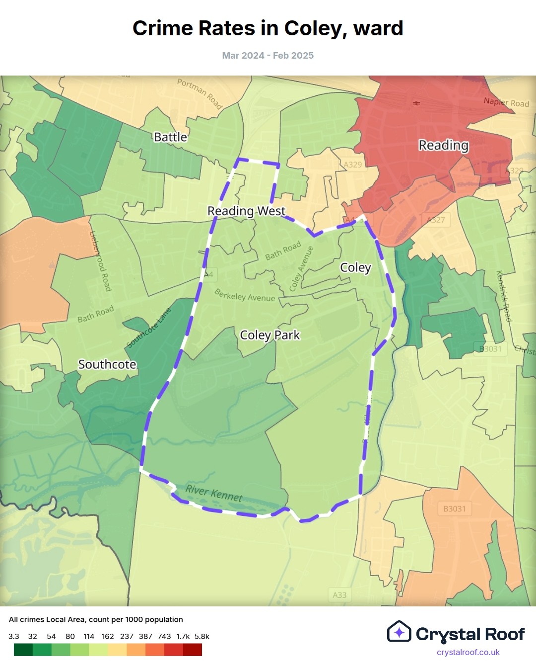 Coley (ward) is located within Reading (borough). Annual total crime rate in Reading (borough) is 112 crimes per thousand resident population, which can be rated as 5 out of 10 or medium crime level compared to other local authority districts in England and Wales.
