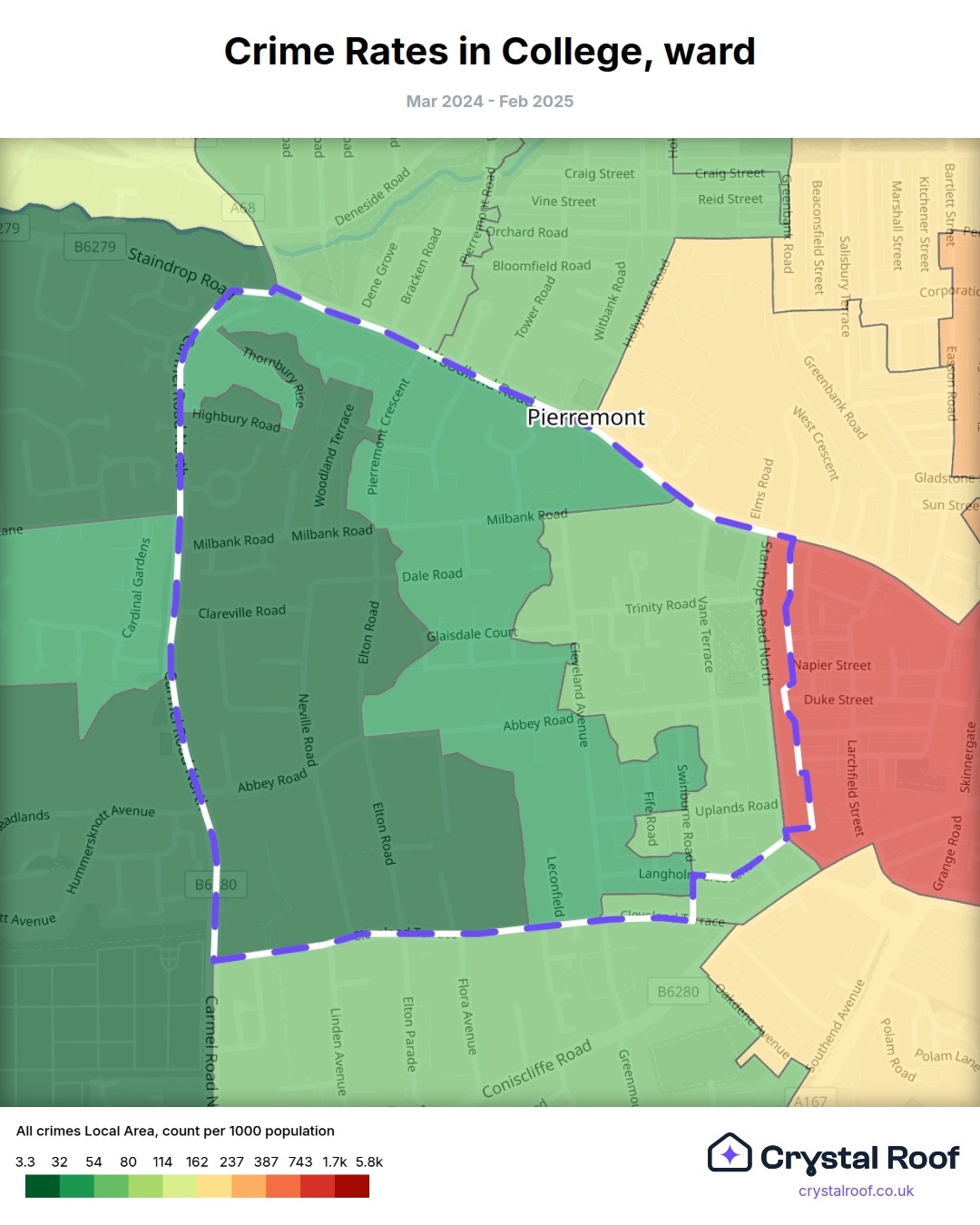College (ward) is located within Darlington (borough). Annual total crime rate in Darlington (borough) is 112 crimes per thousand resident population, which can be rated as 5 out of 10 or medium crime level compared to other local authority districts in England and Wales.