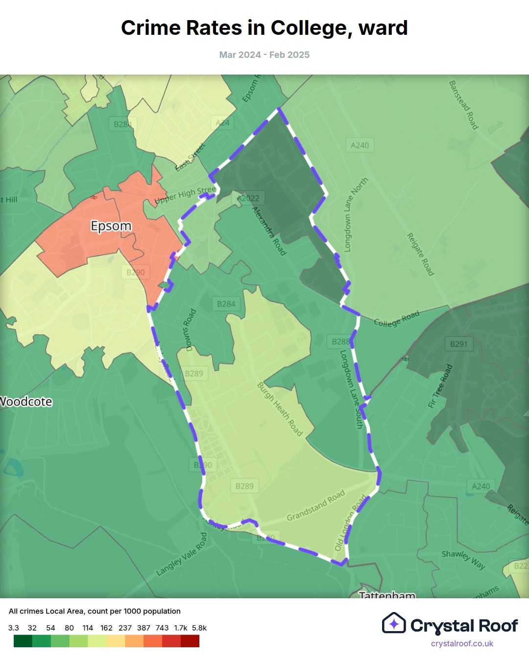 College (ward) is located within Epsom and Ewell (borough). Annual total crime rate in Epsom and Ewell (borough) is 81.7 crimes per thousand resident population, which can be rated as 3 out of 10 or low crime level compared to other local authority districts in England and Wales.