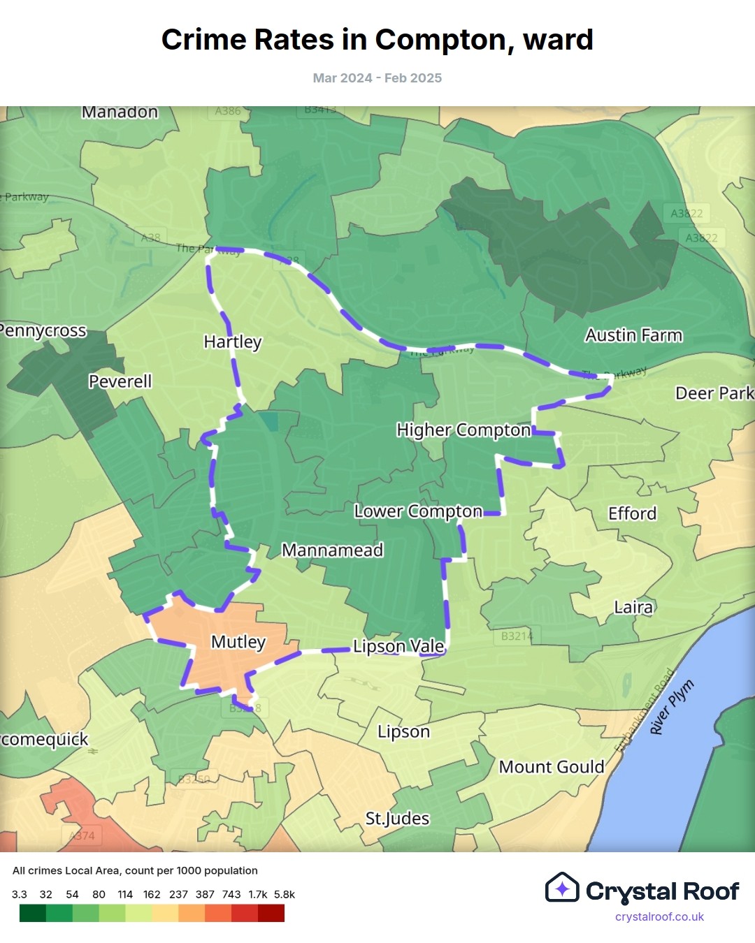 Compton (ward) is located within Plymouth (borough). Annual total crime rate in Plymouth (borough) is 114 crimes per thousand resident population, which can be rated as 5 out of 10 or medium crime level compared to other local authority districts in England and Wales.