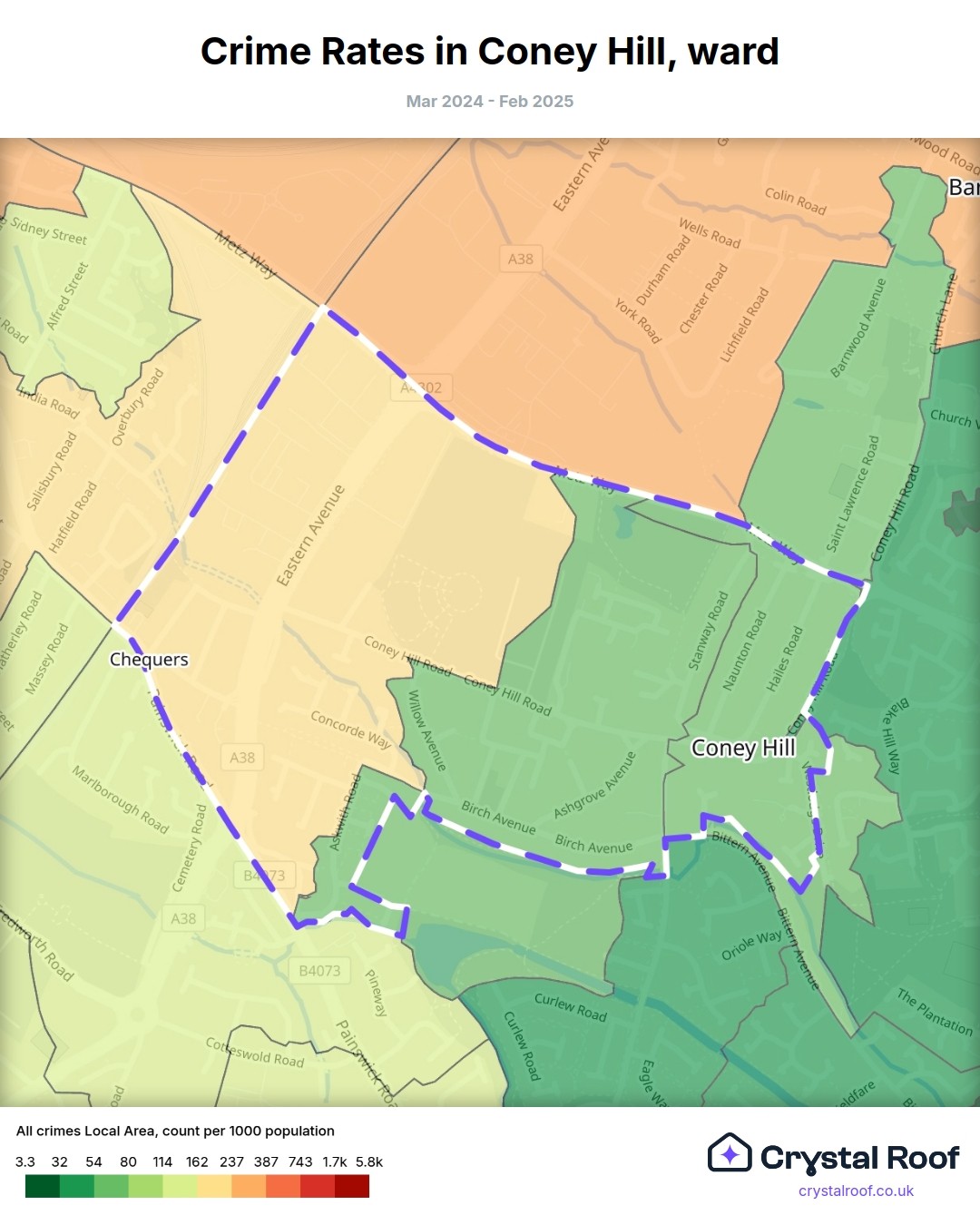 Coney Hill, (ward) includes areas with the following crime ratings (see map):