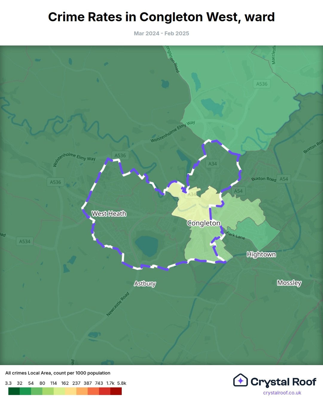 The figures in grey indicate the relative ratings of Congleton West (ward) for a specific crime type compared to other wards in England and Wales.
