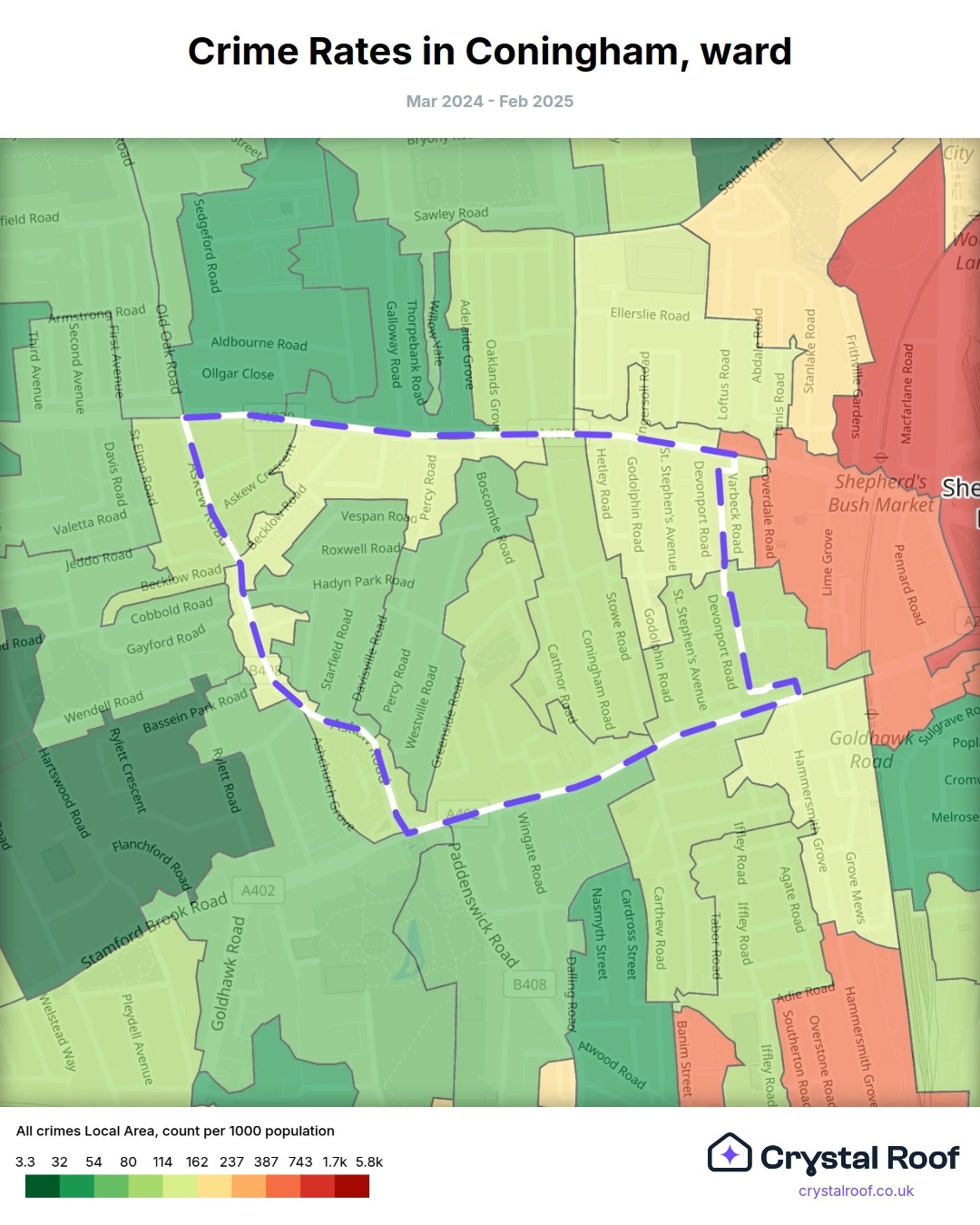 Coningham, (ward) includes areas with the following crime ratings (see map):