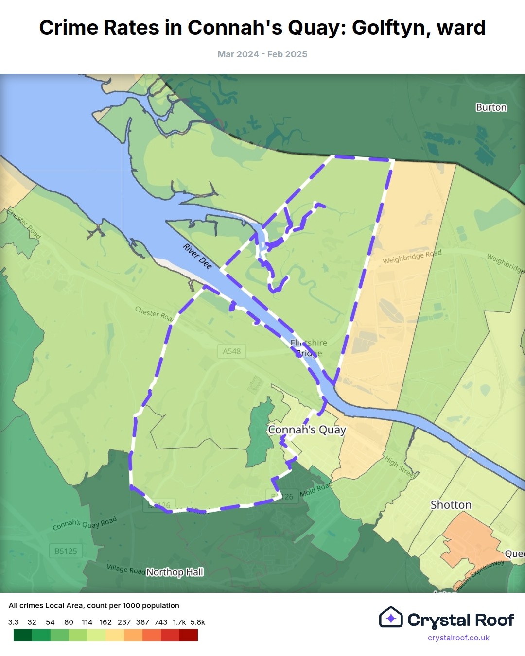 Connah's Quay: Golftyn (ward) is located within Flintshire (borough). Annual total crime rate in Flintshire (borough) is 79.5 crimes per thousand resident population, which can be rated as 3 out of 10 or low crime level compared to other local authority districts in England and Wales.
