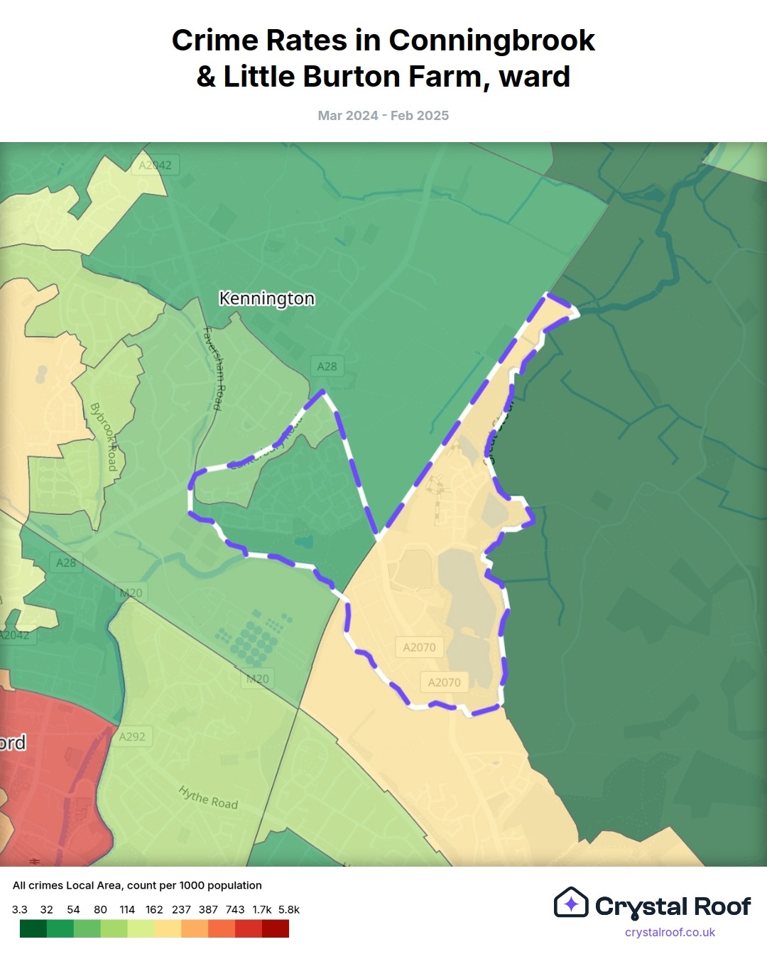 The figures in grey indicate the relative ratings of Conningbrook & Little Burton Farm (ward) for a specific crime type compared to other wards in England and Wales.