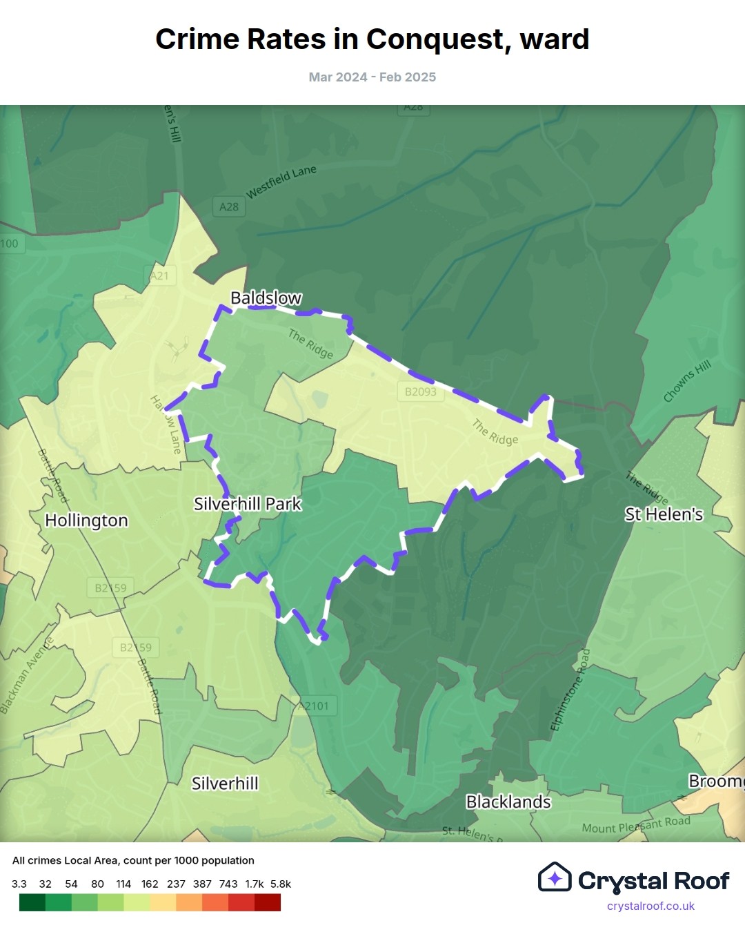 Conquest, (ward) includes areas with the following crime ratings (see map):