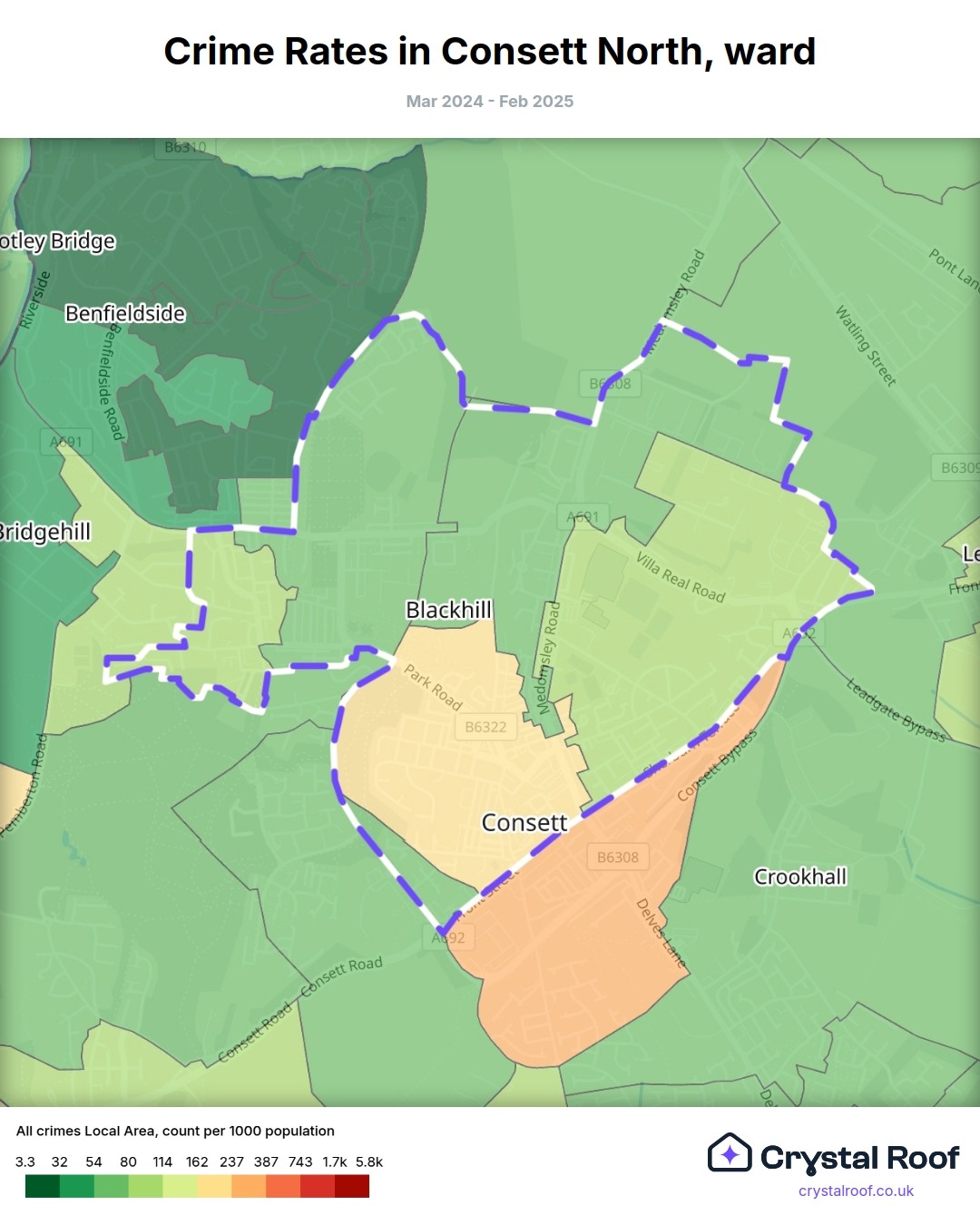The figures in grey indicate the relative ratings of Consett North (ward) for a specific crime type compared to other wards in England and Wales.