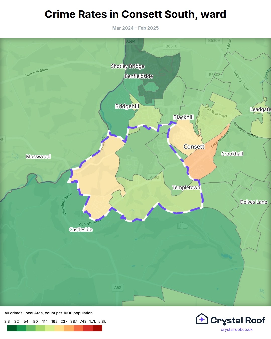 Consett South, (ward) includes areas with the following crime ratings (see map):