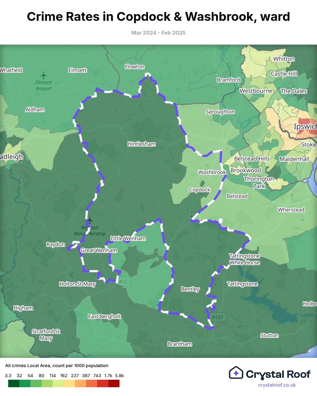 Copdock & Washbrook, (ward) includes areas with the following crime ratings (see map):