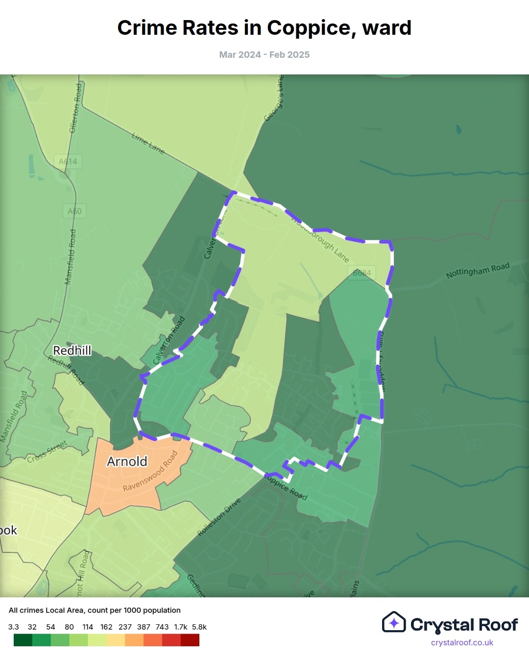 Coppice (ward) is located within Gedling (borough). Annual total crime rate in Gedling (borough) is 64.5 crimes per thousand resident population, which can be rated as 2 out of 10 or low crime level compared to other local authority districts in England and Wales.