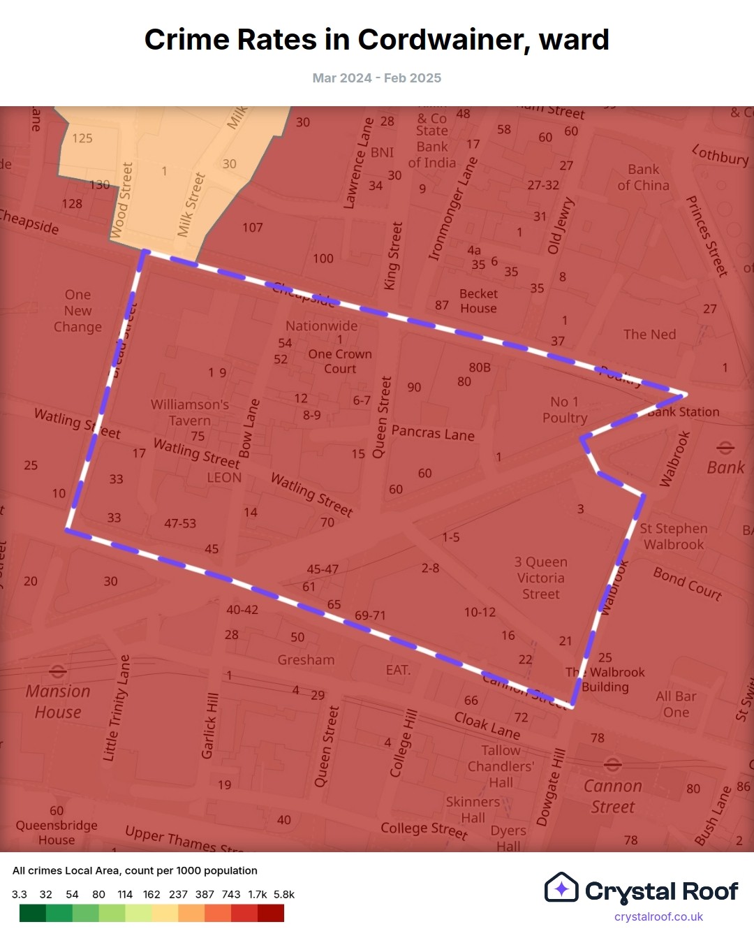 Cordwainer (ward) is located within City of London (borough). Annual total crime rate in City of London (borough) is 872 crimes per thousand resident population, which can be rated as 10 out of 10 or high crime level compared to other local authority districts in England and Wales.