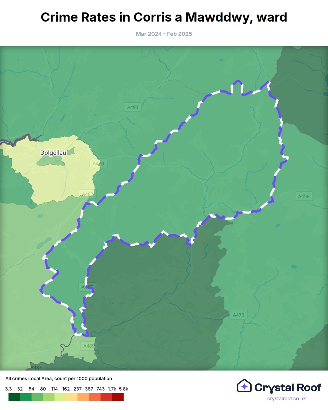 Corris a Mawddwy, (ward) includes areas with the following crime ratings (see map):