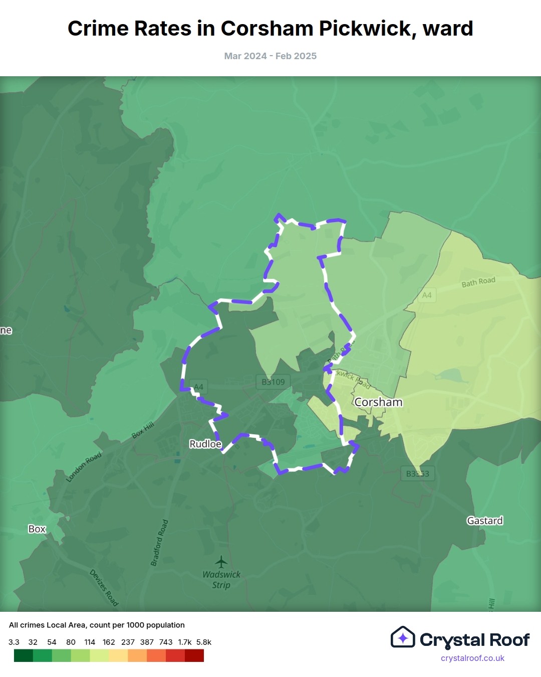 Corsham Pickwick, (ward) includes areas with the following crime ratings (see map):