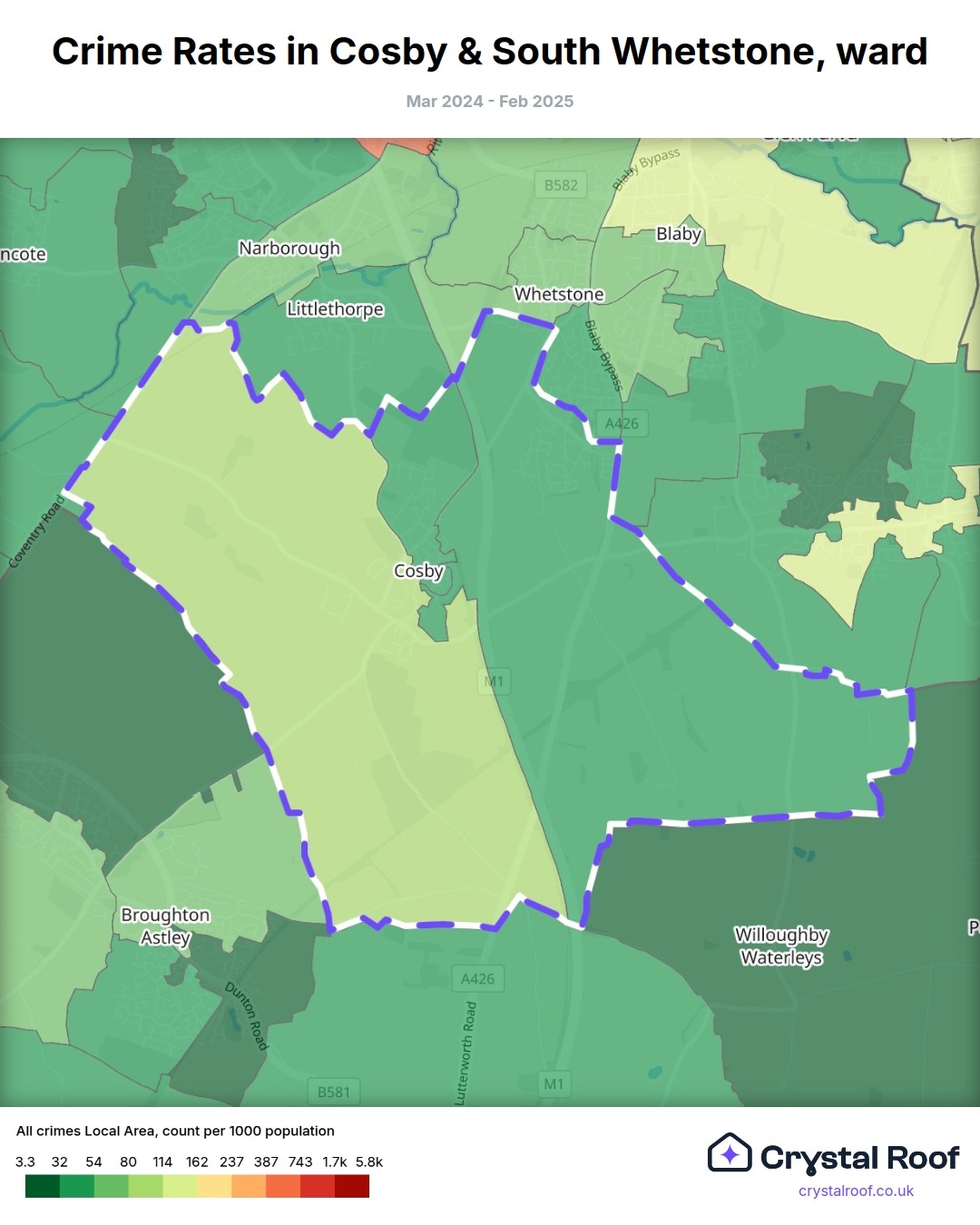The figures in grey indicate the relative ratings of Cosby & South Whetstone (ward) for a specific crime type compared to other wards in England and Wales.