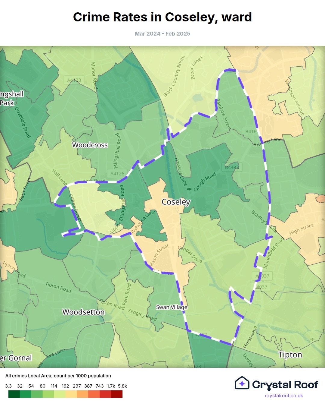 Coseley, (ward) includes areas with the following crime ratings (see map):