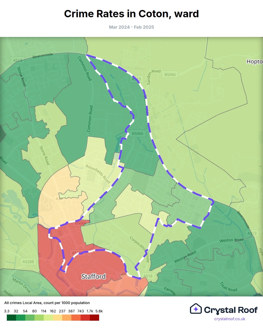 Coton (ward) is located within Stafford (borough). Annual total crime rate in Stafford (borough) is 74.9 crimes per thousand resident population, which can be rated as 3 out of 10 or low crime level compared to other local authority districts in England and Wales.