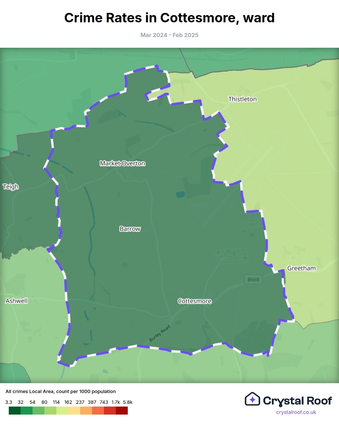Cottesmore, (ward) includes areas with the following crime ratings (see map):