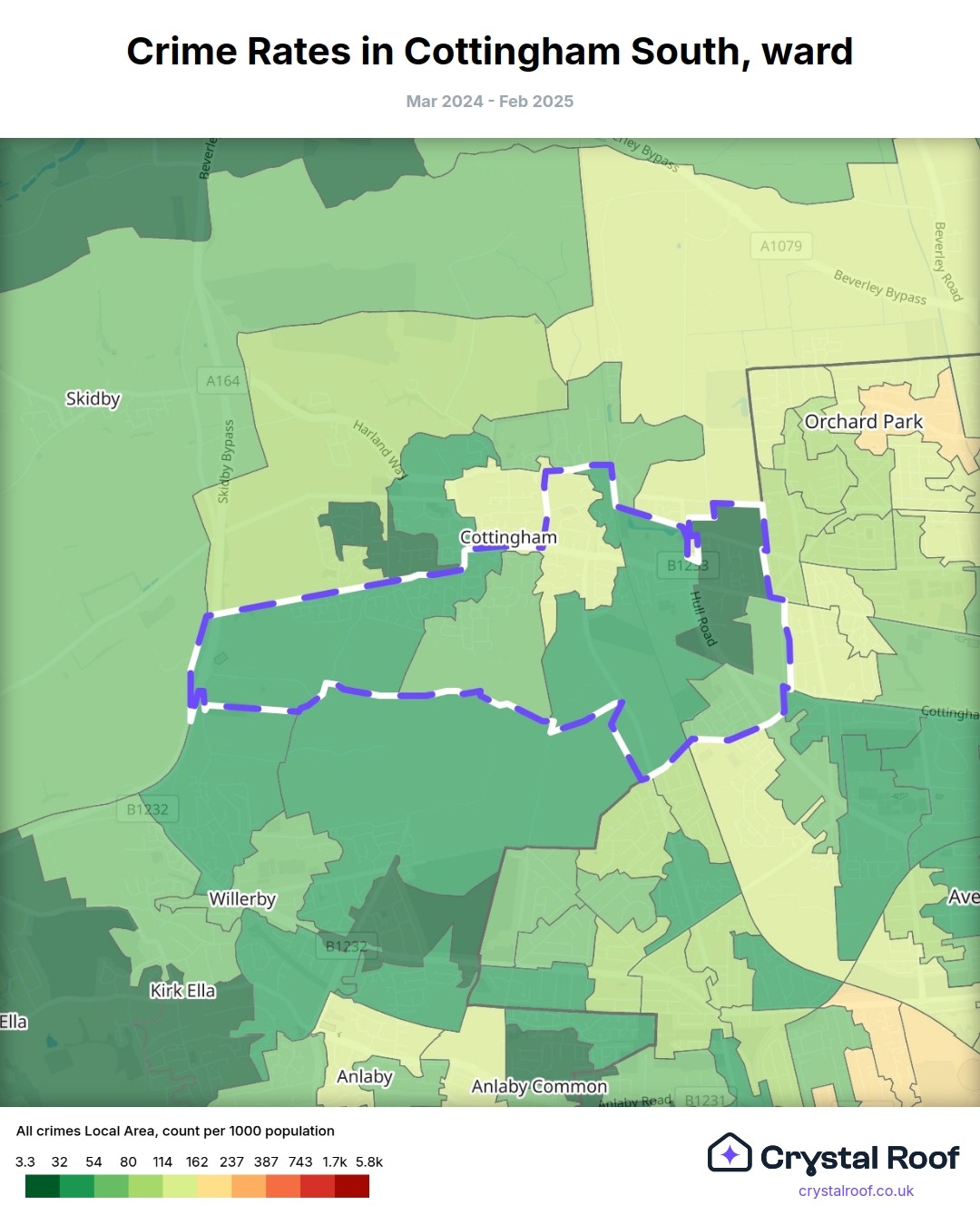 Cottingham South, (ward) includes areas with the following crime ratings (see map):
