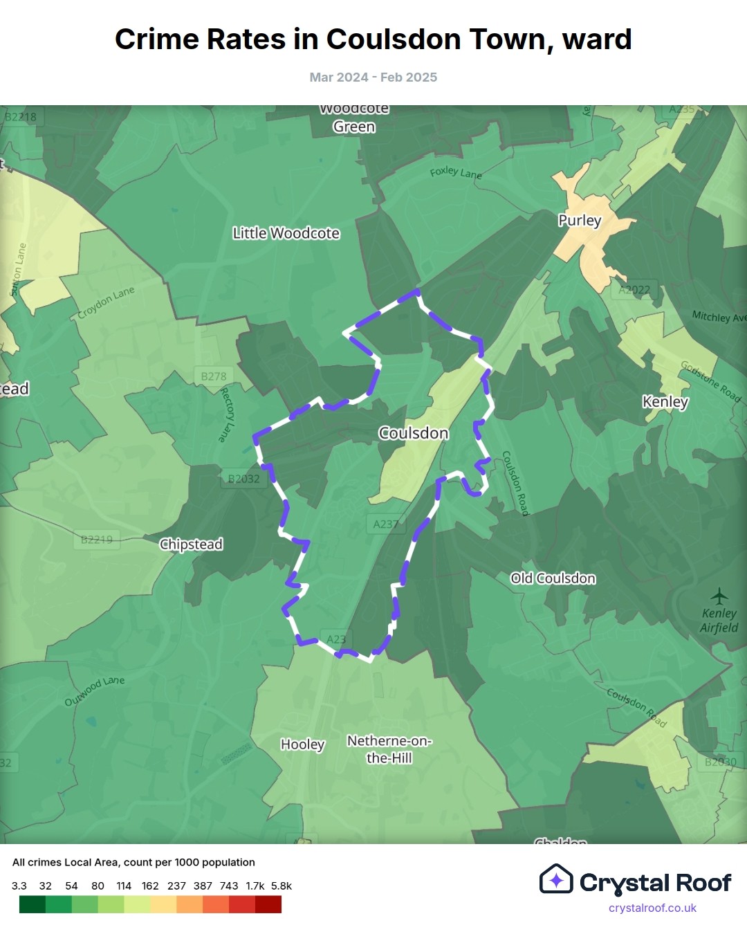 Coulsdon Town, (ward) includes areas with the following crime ratings (see map):