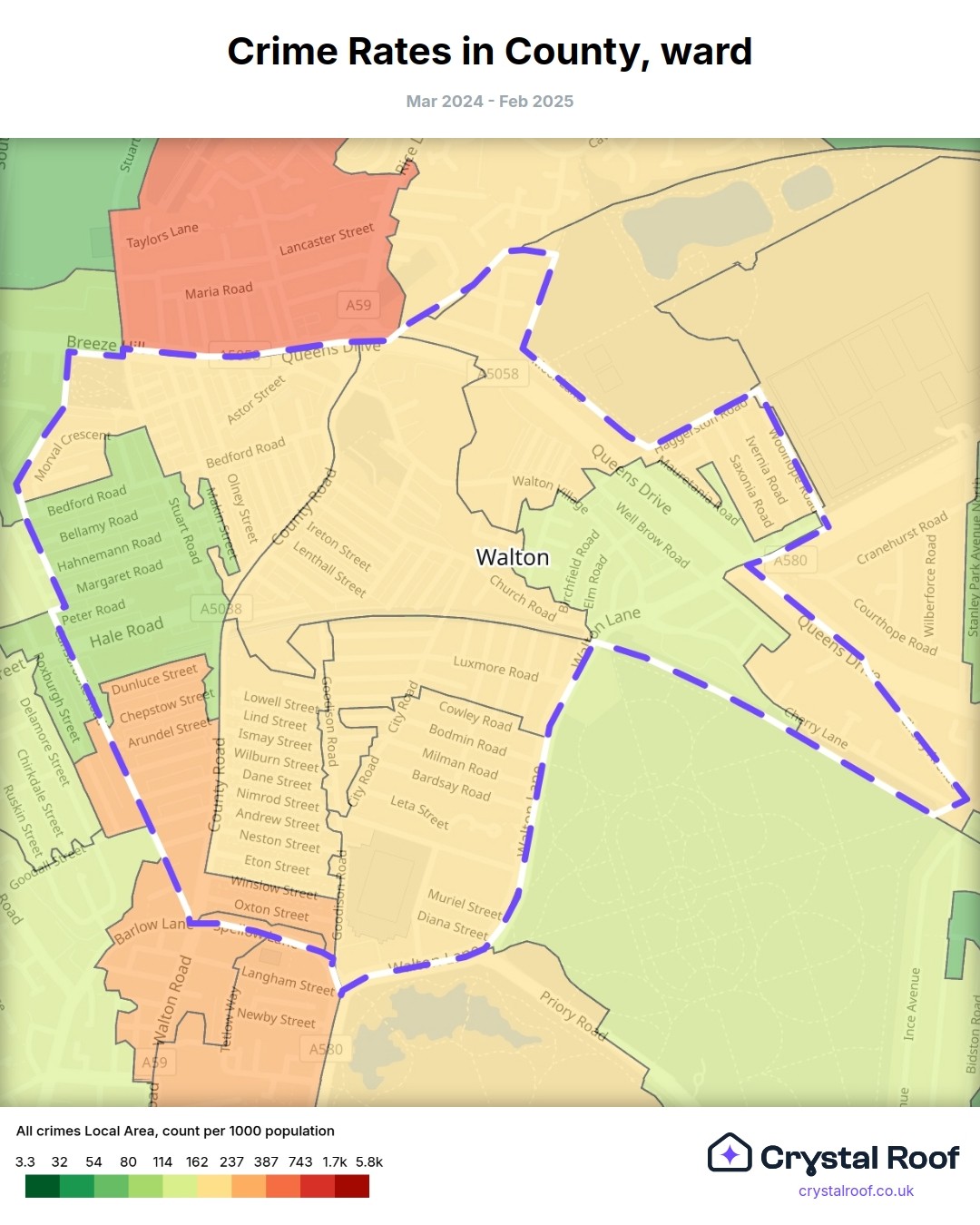 County (ward) is located within Liverpool (borough). Annual total crime rate in Liverpool (borough) is 141 crimes per thousand resident population, which can be rated as 7 out of 10 or high crime level compared to other local authority districts in England and Wales.