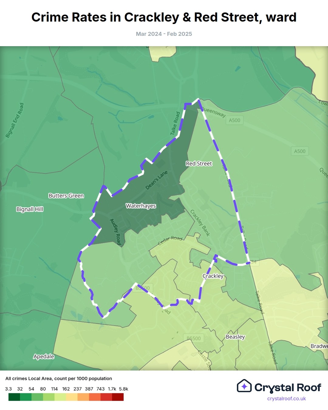 Crackley & Red Street, (ward) includes areas with the following crime ratings (see map):