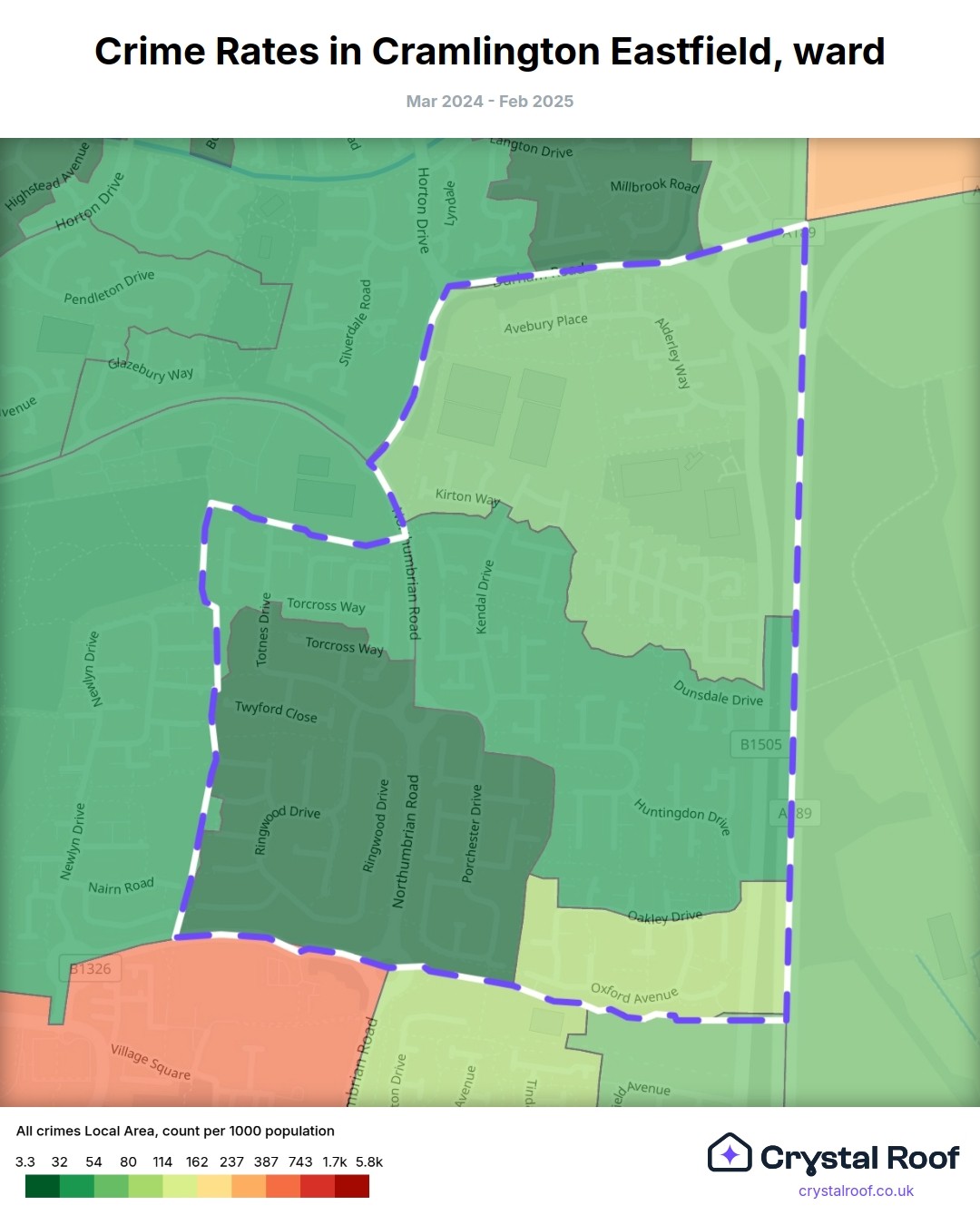 Cramlington Eastfield, (ward) includes areas with the following crime ratings (see map):