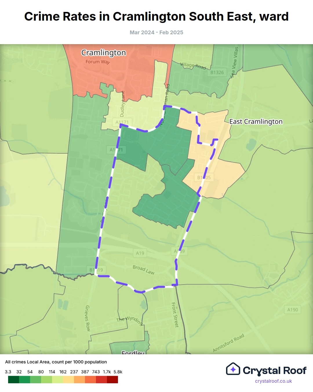 Cramlington South East, (ward) includes areas with the following crime ratings (see map):