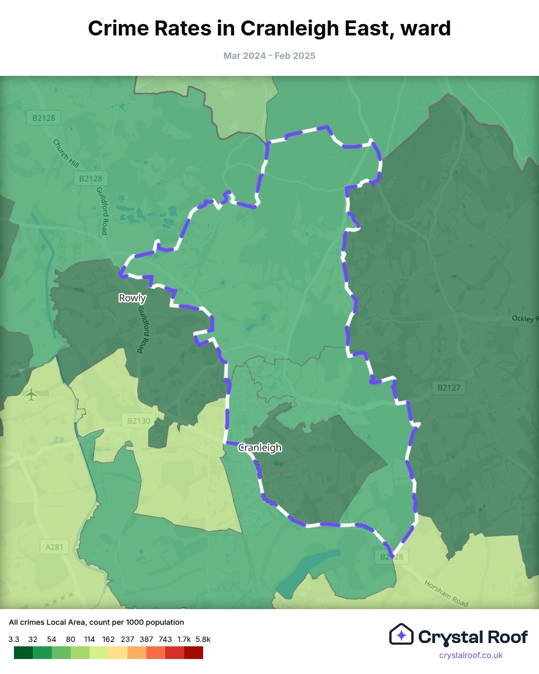 Cranleigh East, (ward) includes areas with the following crime ratings (see map):