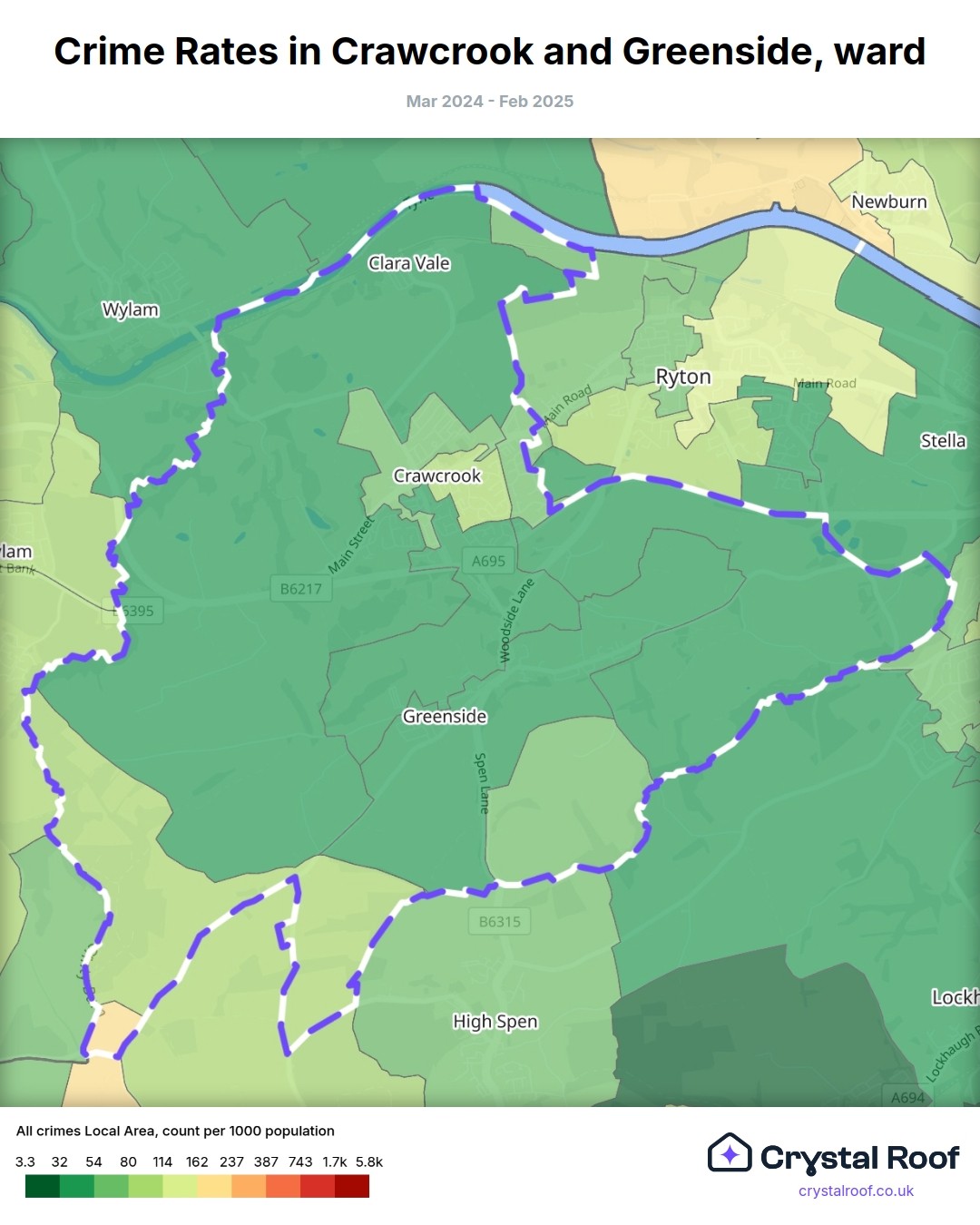 Crawcrook and Greenside, (ward) includes areas with the following crime ratings (see map):