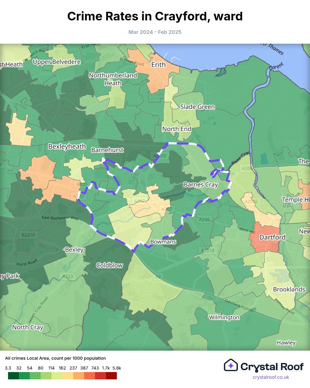 Crayford, (ward) includes areas with the following crime ratings (see map):