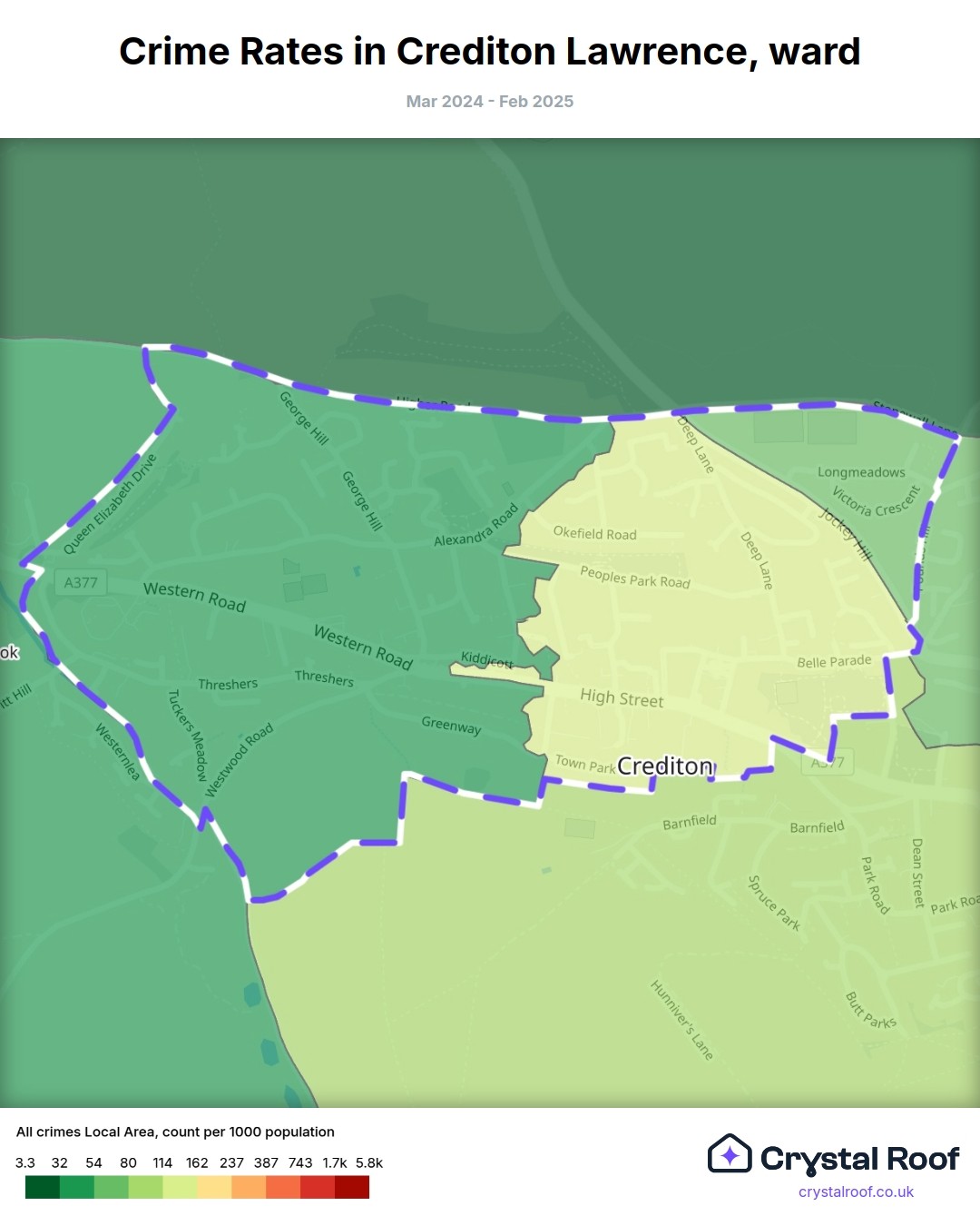 Crediton Lawrence, (ward) includes areas with the following crime ratings (see map):