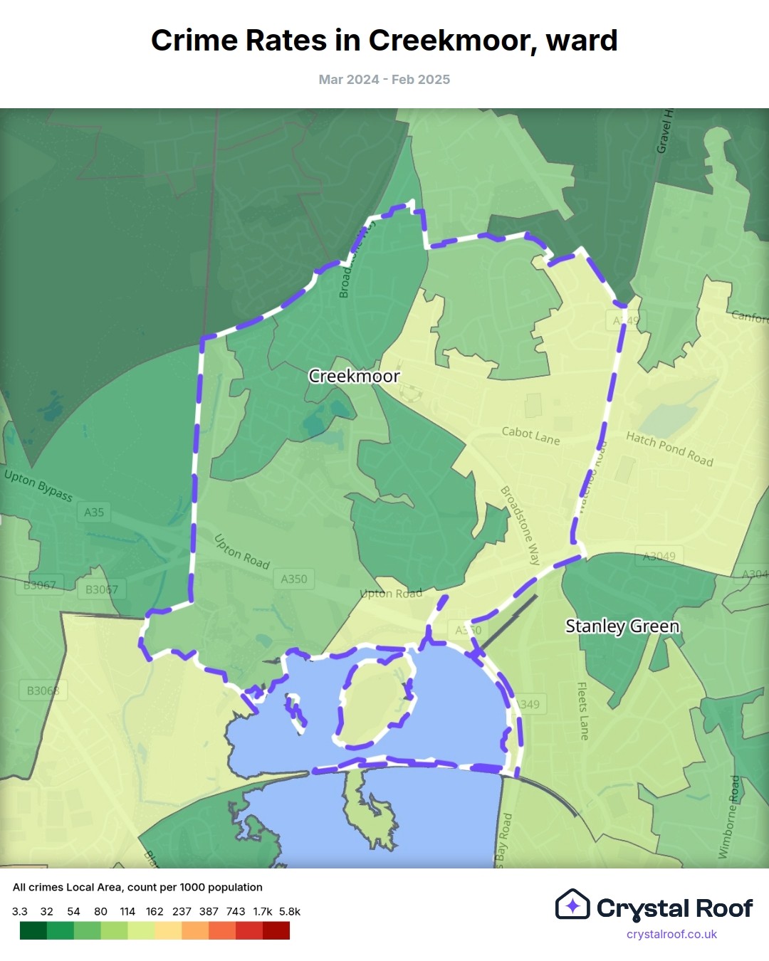 Creekmoor, (ward) includes areas with the following crime ratings (see map):