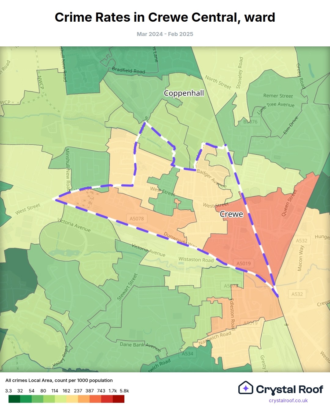 The figures in grey indicate the relative ratings of Crewe Central (ward) for a specific crime type compared to other wards in England and Wales.